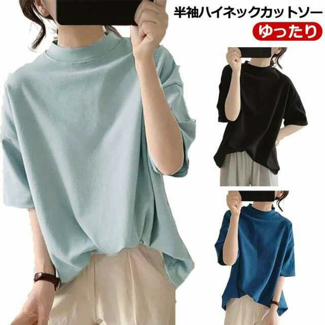 5分袖 夏 ハイネック カットソー カットソー Tシャツ 送料無料 送料無料 半袖 ドロップショルダー トップス 半袖ハイネックカットソー レディース モックネック ゆったり 体型カバー ゆる